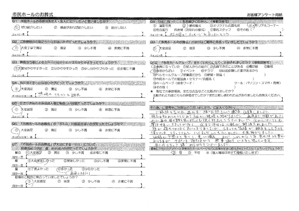 このたびは心のこもったご感想を賜り、誠にありがとうございます。初めてのご葬儀でご不安の中、安心してお任せいただけたことを大変光栄に存じます。お母様とのお時間やお孫様への対応についてもお役に立てたことを、スタッフ一同励みにしております。今後のご法要も引き続きお手伝いしてまいります。