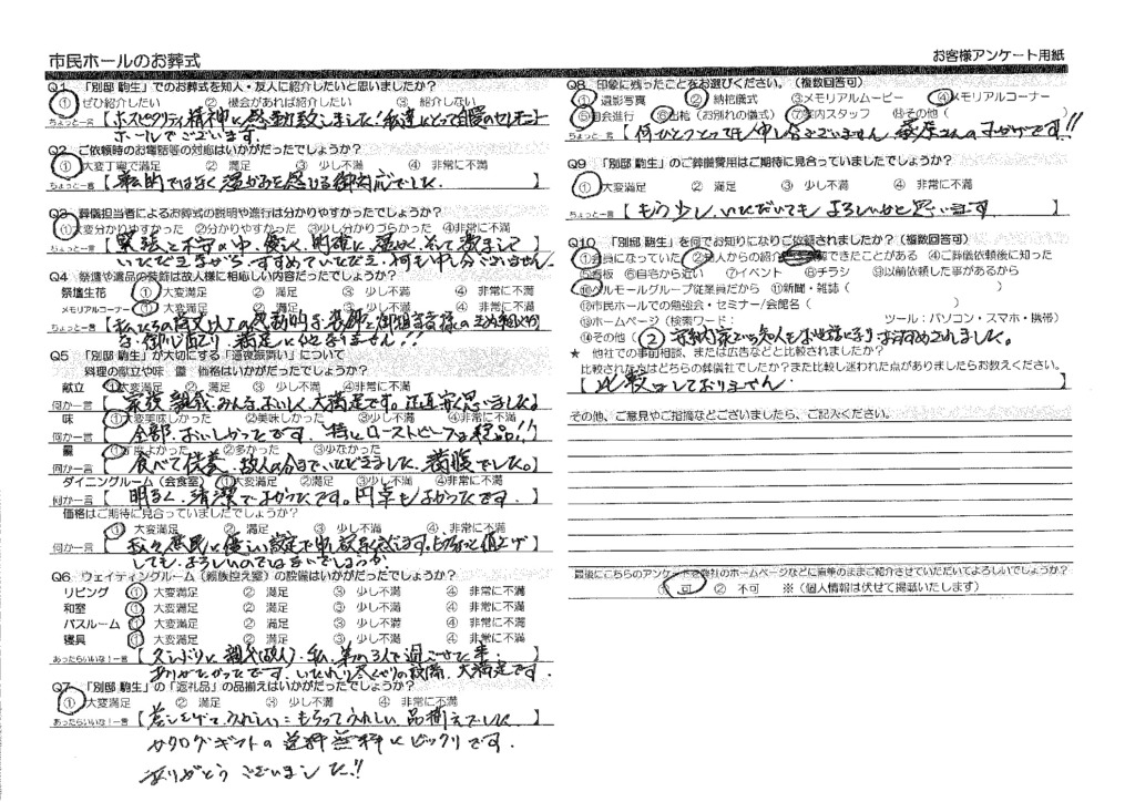 このたびは別邸駒生でのご葬儀に際し、心温まるご感想をいただき誠にありがとうございます。スタッフの対応やお料理、設備にご満足いただけたことを大変嬉しく拝見いたしました。今後も心に残るお見送りをお手伝いできるよう努めてまいります。