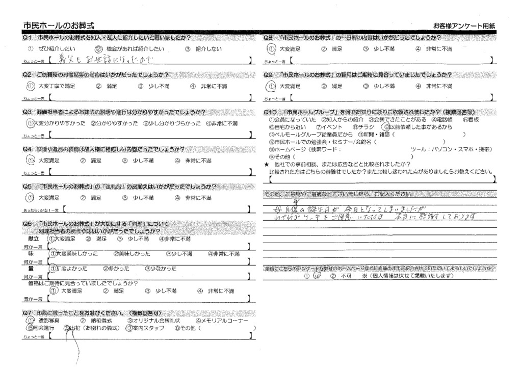 お母様への想いに寄り添えましたことに感謝申しあげます 2025年12月 宇都宮市のお客様の声 ご利用斎場駒生市民ホール 葬儀形式一日葬 ご利用者様の声(口コミ・評価) 母自身の誕生日が命日になってしまいましたが、わざわざケーキをご用意いただき本当に感謝しております。 担当者からのメッセージ このたびは心温まるお言葉をお寄せいただき、誠にありがとうございます。お母様のお誕生日と重なる大切な一日に、ささやかではございますが想いを形にできましたことを、スタッフ一同光栄に存じます。今後もご家族の心に寄り添うお手伝いに努めてまいります。