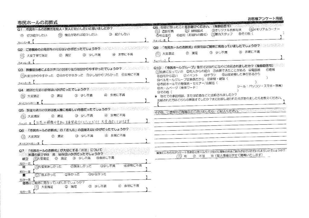お花へのご要望にお応えできましたことに感謝申し上げます 2025年12月 宇都宮市のお客様の声 ご利用斎場川田市民ホール 葬儀形式一般葬 ご利用者様の声(口コミ・評価) お花の種類や色あいを希望通りにしていただけて、大変満足しております。 担当者からのメッセージ このたびは温かいお言葉をいただき、誠にありがとうございます。お花の種類や色あいにつきまして、ご希望通りに整えることができ、ご満足いただけたとのことを大変嬉しく存じます。今後も想いを大切にしたお見送りを心を込めてお手伝いしてまいります。