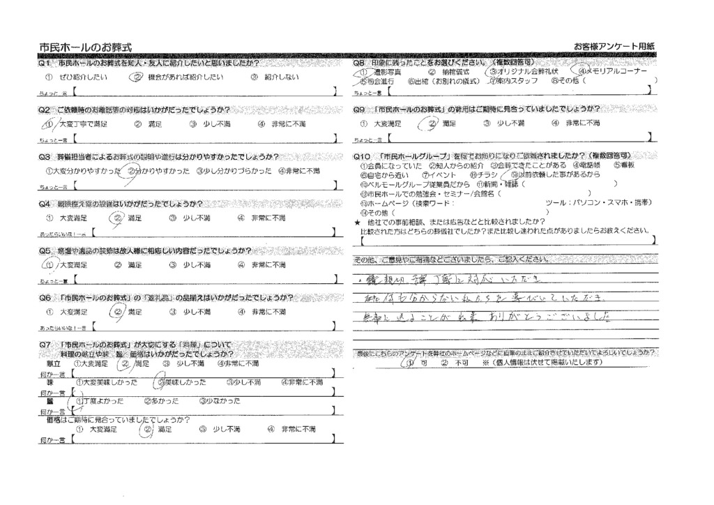 温かいお言葉をいただき心より御礼申し上げます 2026年02月 宇都宮市のお客様の声 ご利用斎場駒生市民ホール 葬儀形式一般葬 ご利用者様の声(口コミ・評価) 親切丁寧に対応いただき、何も分からない私たちを導いていただき無事に送ることが出来ありがとうございました。 担当者からのメッセージ このたびはご丁寧なご感想をお寄せいただき、誠にありがとうございます。初めてのことでご不安も多い中、安心してお任せいただき、無事にお見送りいただけたとのお言葉を大変ありがたく拝見いたしました。
